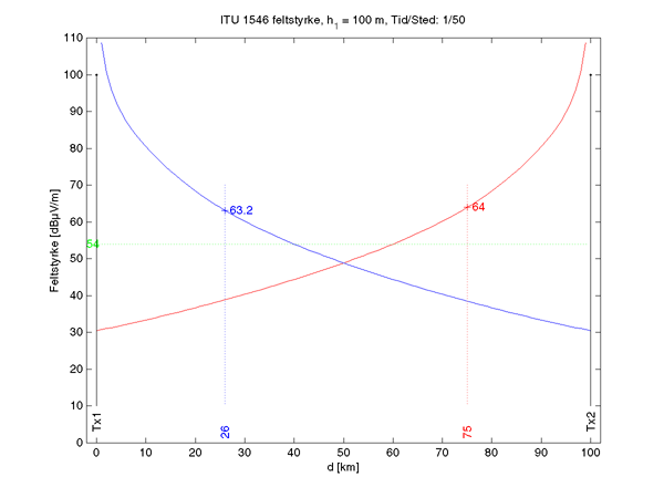 Her forestiller vi os to 10 kW sendere med en antennehøjde på 100 m og afstanden mellem dem er 100 km. Kurverne viser de to senderes feltstyrke iflg. ITU 1546 [3]. 54 dBµV grænsen er tegnet ind som den grønne linje. Det interessante er så hvornår afstanden mellem de to kurver er mindre end 25 dB. Det er den i intervallet mellem km. 26 og 75 fra Tx1. Dvs. vi har en strækning på 50 km mellem de to sendere, som risikerer at have dårlig dækning pga. SFN-problemer.